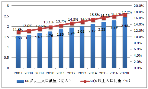 《 2017-2022年中國養老產業發展現狀及未來投資方向研究報告 》 中國人口老齡化趨勢預測 據統計,2015年60歲及以上人口達到2.22億,占總人口的16.15%。預計到2020年,老年人口達到2.48億,老齡...