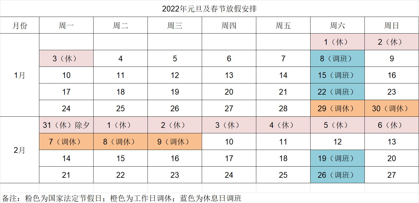 2022年元旦、春節(jié)假期將至,根據(jù)國(guó)家節(jié)假日放假規(guī)定,并結(jié)合公司實(shí)際情況,經(jīng)研究決定,現(xiàn)將2022年公司休假安排如下: