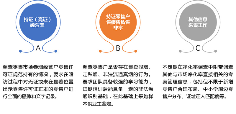華夏經緯根據區域經濟、客戶分布、業態布局、卷煙銷量等因素,結合各地煙草市場的特點,因地制宜為監測區域構建獨立的市場凈化率抽樣模型,科學、全面體現當地煙草市場凈化率。市場凈化率調查的主要內容包括(不限于)持證(亮證)經營率和持證零售戶售假售私售非率等信息。