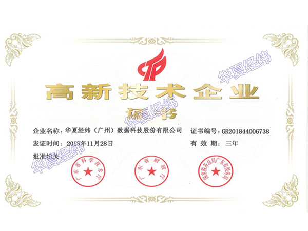 2018年12月16日,華夏經(jīng)緯(廣州)數(shù)據(jù)科技股份有限公司通過了由廣東省科技廳、廣東省財(cái)政廳、國家稅務(wù)總局廣東省稅務(wù)局組織的國家高新技術(shù)企業(yè)認(rèn)定,并榮獲國家“高新技術(shù)企業(yè)”稱號(hào),由此正式邁入國家高新技術(shù)企業(yè)行列。