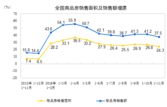 1-11月份,商品房銷售面積135829萬平方米,同比增長24.3%,增速比1-10月份回落2.5個百分點。其中,住宅銷售面積增長24.5%,辦公樓銷售面積增長31.4%,商業營業用房銷售面積增長17.5%。商品房銷售額102503億元,增長37.5%,增速回落3.7個百分點。其中,住宅銷售額增長39.3%,辦公樓銷售額增長46.5%,商業營業用房銷售額增長20.1%。