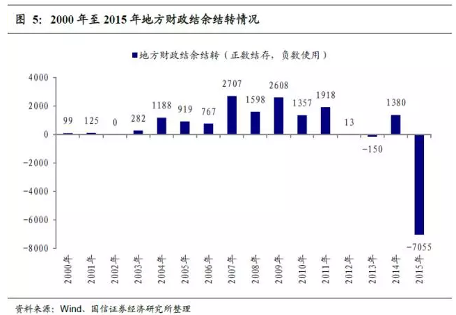 財政結余在2015年和2016年連續兩年被大量使用,這使得過去兩年的實際赤字數要遠高于預算財政赤字數(圖7)。以2015年為例,預算財政赤字為1.62萬億,而實際赤字高達2.31萬億,意味著通過使用財政結余是的赤字提高了近43%。